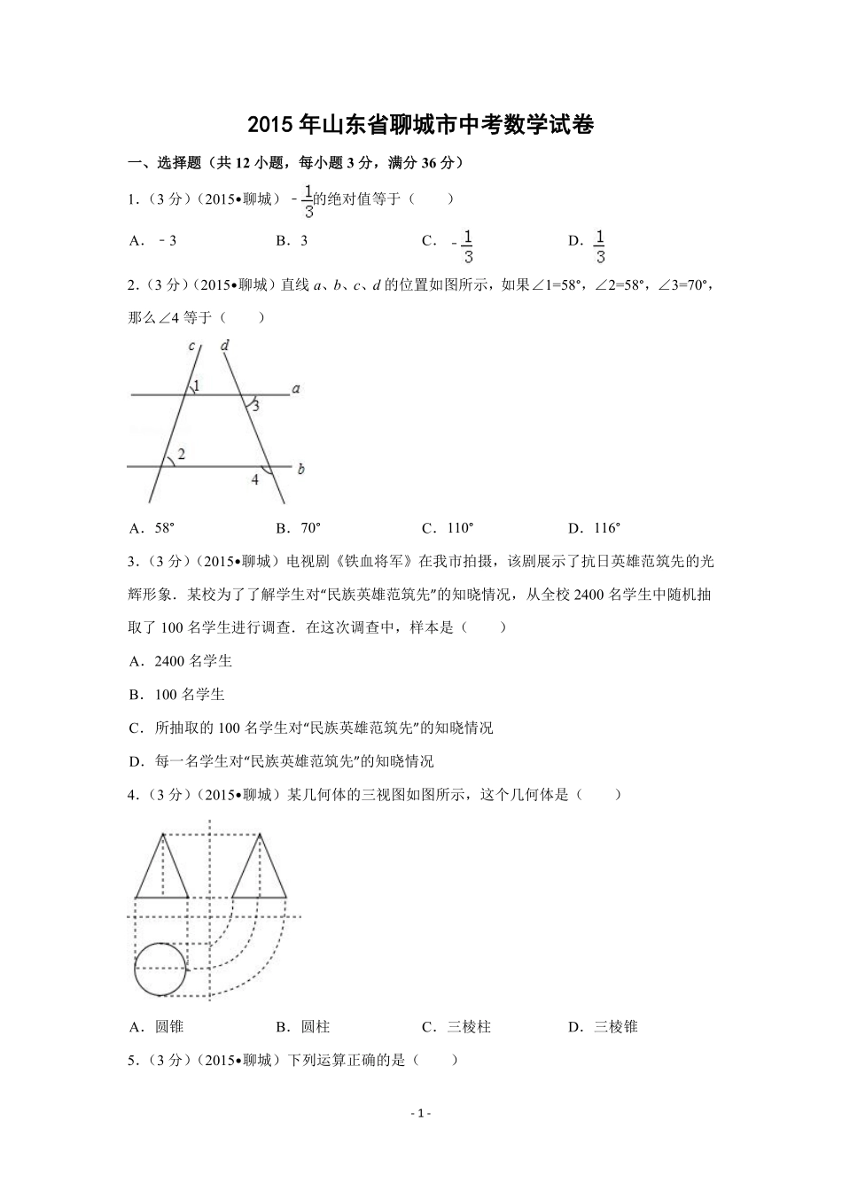 -1-2015年山东省聊城市中考数学试卷一、选择题(共12小题,每小题3分,满分36分)1.(3分)(2015•聊城)﹣的绝对值等于()A.﹣3B.3C.﹣D.2.(3分)(2015•聊城)直线a、b、c、d的位置如图所示,如果∠1...