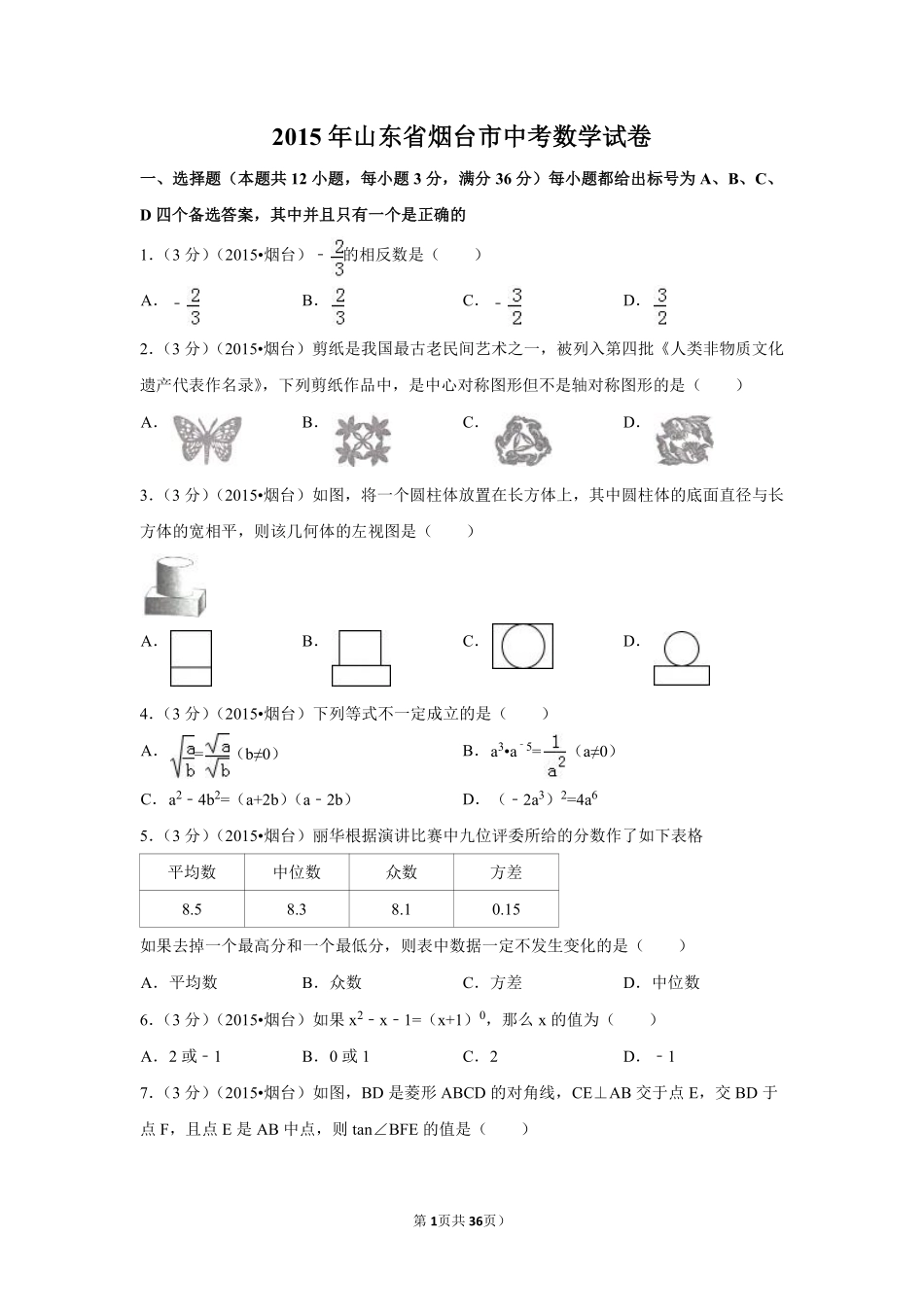 第1页共36页)2015年山东省烟台市中考数学试卷一、选择题(本题共12小题,每小题3分,满分36分)每小题都给出标号为A、B、C、D四个备选答案,其中并且只有一个是正确的1.(3分)(2015•烟台)﹣的相反数是()A...