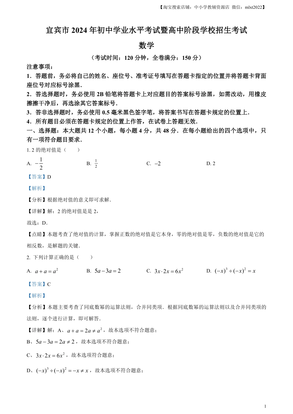 精品解析:2024年四川省宜宾市中考数学试题(解析版).pdf_第2页