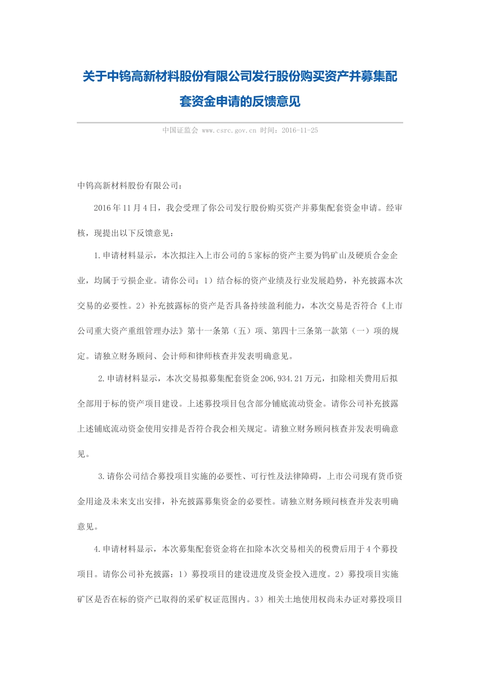关于中钨高新材料股份有限公司发行股份购买资产并募集配套资金申请的反馈意见中国证监会www.csrc.gov.cn时间:2016-11-25中钨高新材料股份有限公司:2016年11月4日,我会受理了你公司发行股份购买资产并募集配套...