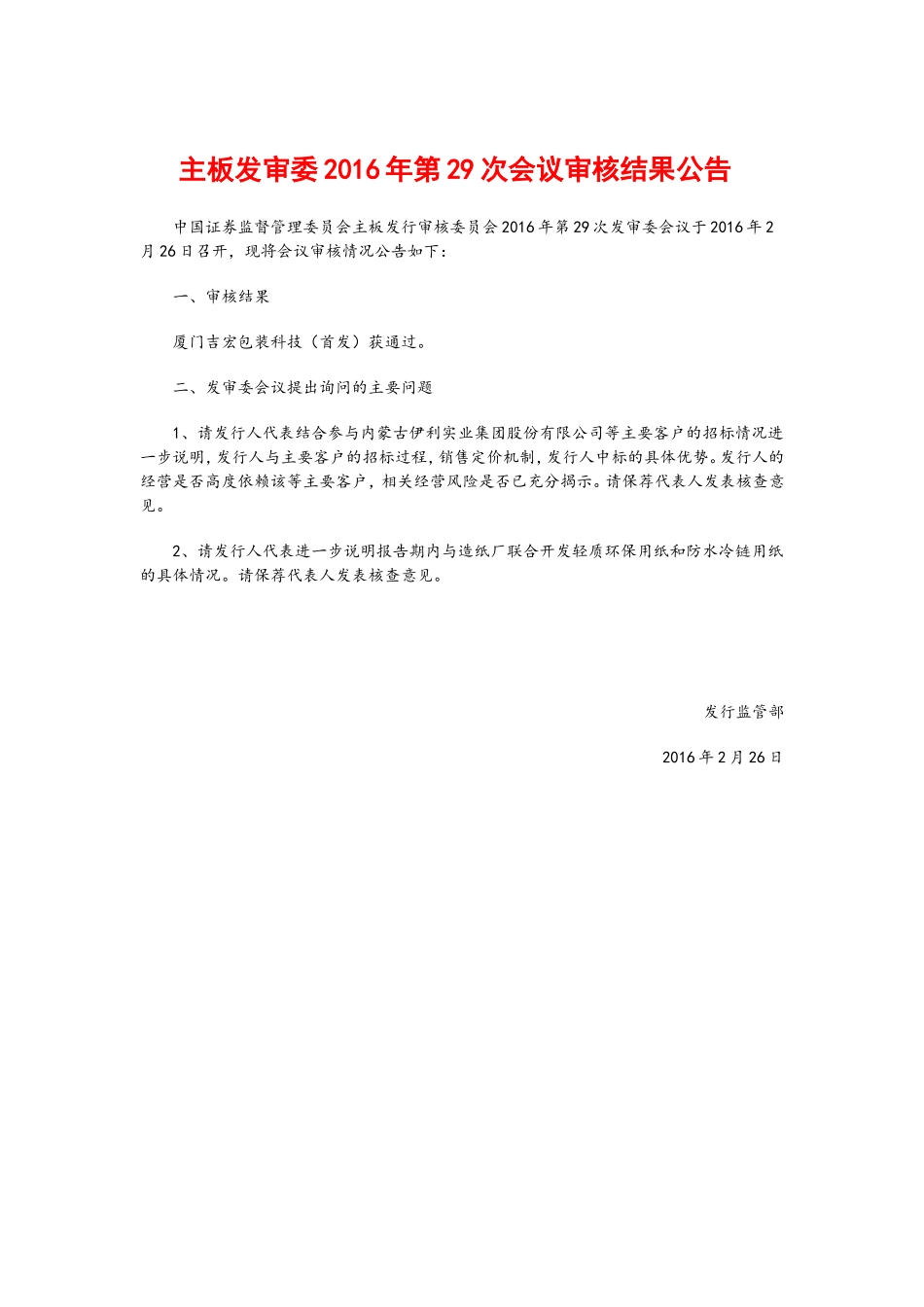 主板发审委2016年第29次会议审核结果公告中国证券监督管理委员会主板发行审核委员会2016年第29次发审委会议于2016年2月26日召开,现将会议审核情况公告如下:一、审核结果厦门吉宏包装科技(首发)获通过。二、发...