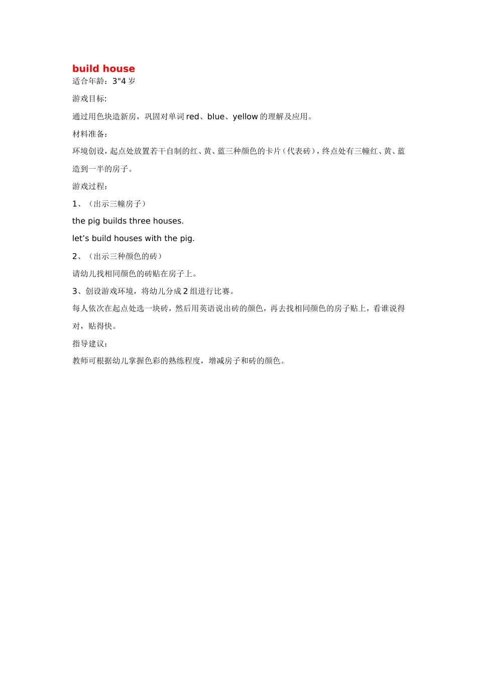 buildhouse适合年龄:3"4岁游戏目标:通过用色块造新房,巩固对单词red、blue、yellow的理解及应用。材料准备:环境创设,起点处放置若干自制的红、黄、蓝三种颜色的卡片(代表砖),终点处有三幢红、黄、蓝造到一...