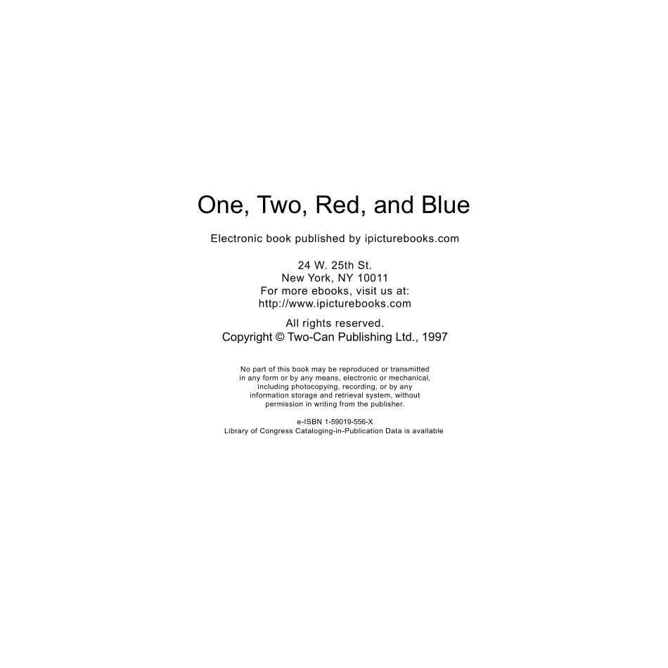One,Two,Red,andBlueElectronicbookpublishedbyipicturebooks.com24W.25thSt.NewYork,NY10011Formoreebooks,visitusat:http://www.ipicturebooks.comAllrightsreserved.Copyright©Two-CanPublishingLtd.,1997Nop...