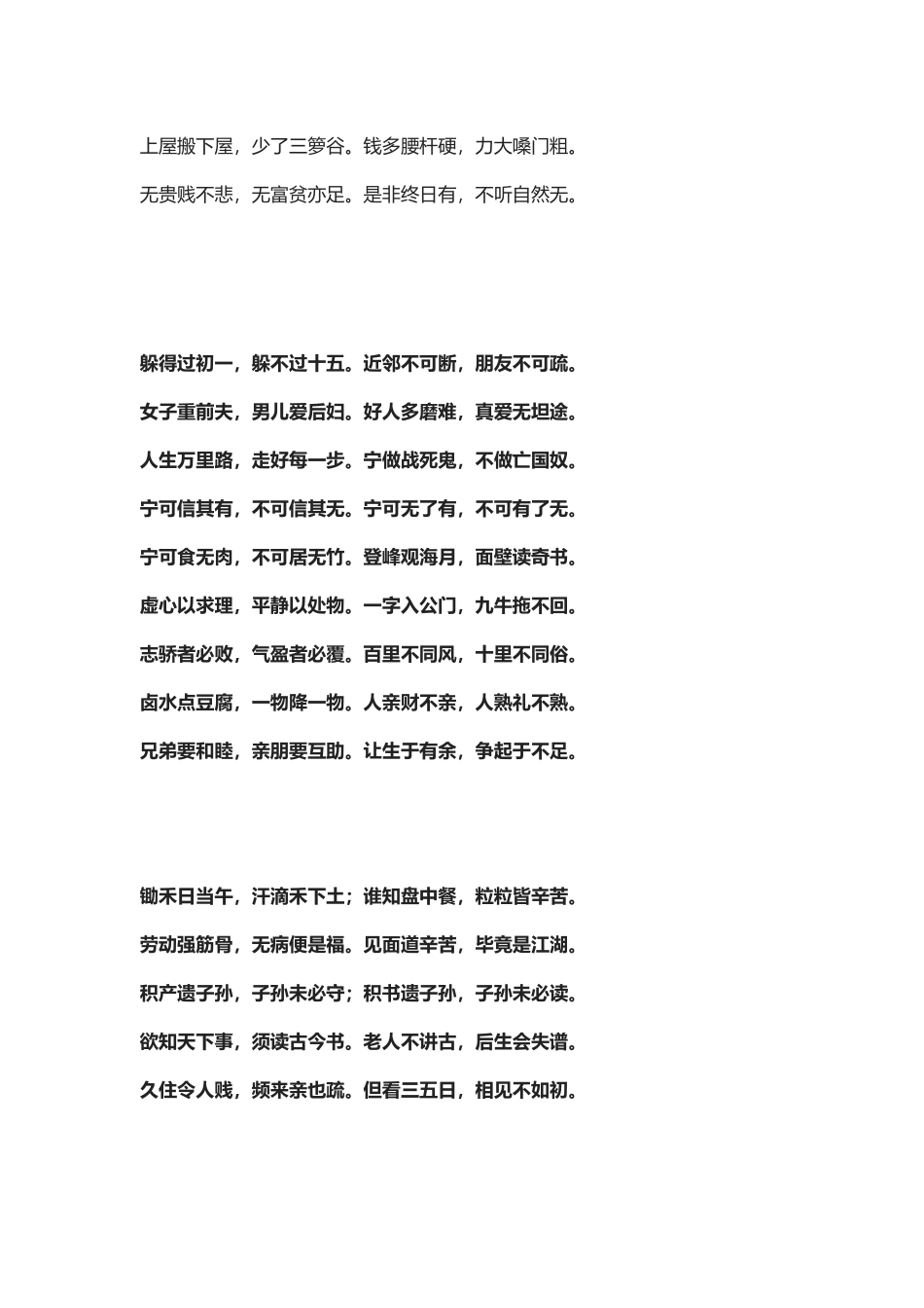 讨老婆看妻舅,买衣裳看衫袖。两家养驴驴瘦,合伙用船船漏。拿得住的是手,掩不住的是口。忍得一时之气,免得百日之忧。勿贪意外之财,不饮过重之酒。宁可清贫自乐,不可浊富多忧。冷汤冷饭好吃,冷言冷语难受。...