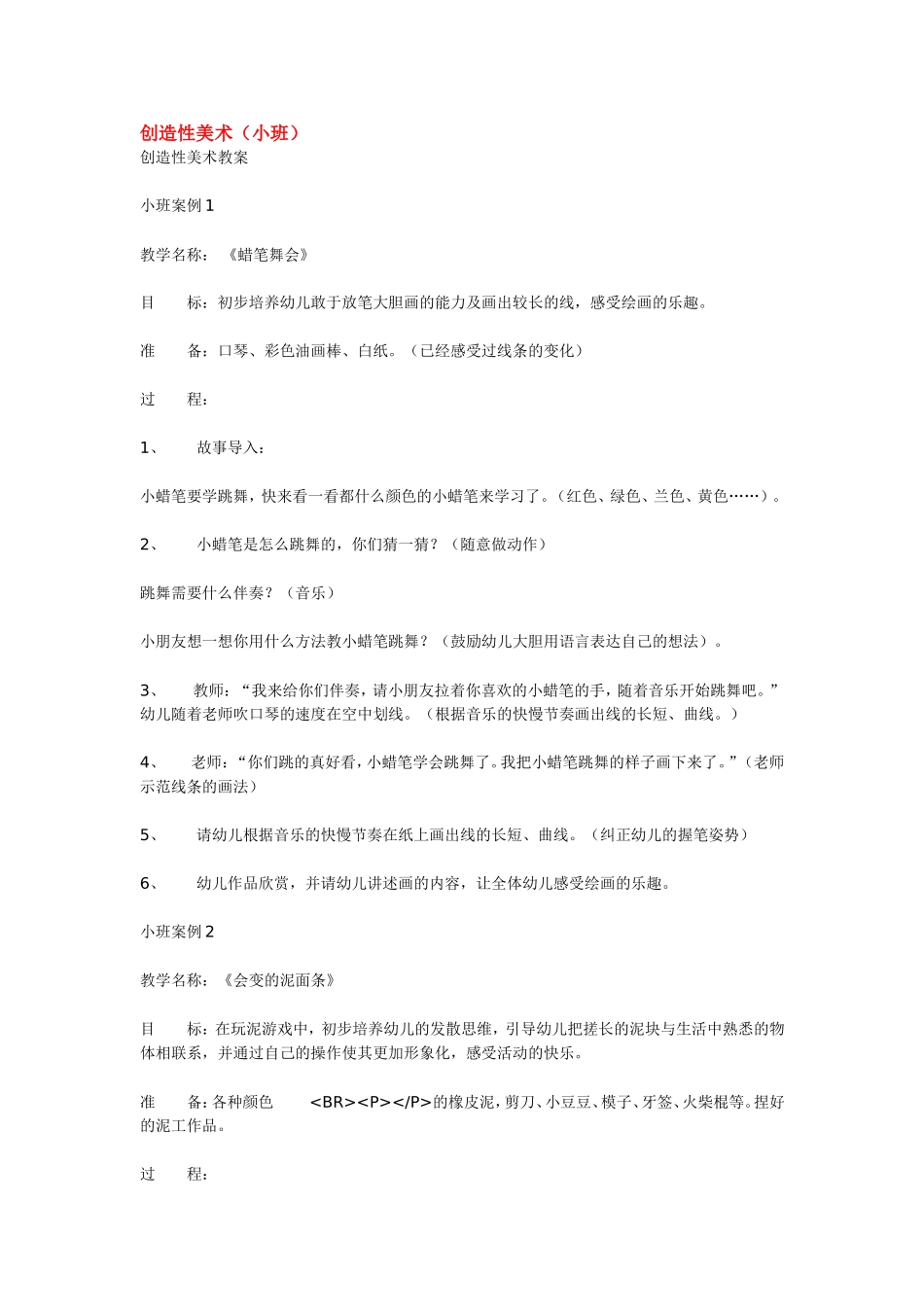创造性美术(小班)创造性美术教案小班案例1教学名称:《蜡笔舞会》目标:初步培养幼儿敢于放笔大胆画的能力及画出较长的线,感受绘画的乐趣。准备:口琴、彩色油画棒、白纸。(已经感受过线条的变化)过程:1、...