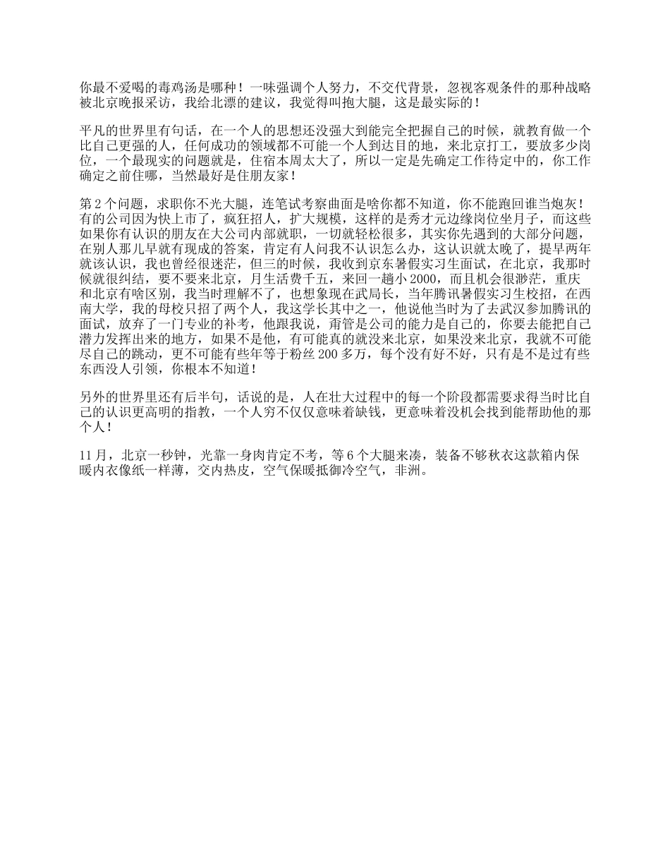 你最不爱喝的毒鸡汤是哪种!一味强调个人努力,不交代背景,忽视客观条件的那种战略被北京晚报采访,我给北漂的建议,我觉得叫抱大腿,这是最实际的!平凡的世界里有句话,在一个人的思想还没强大到能完全把握自...