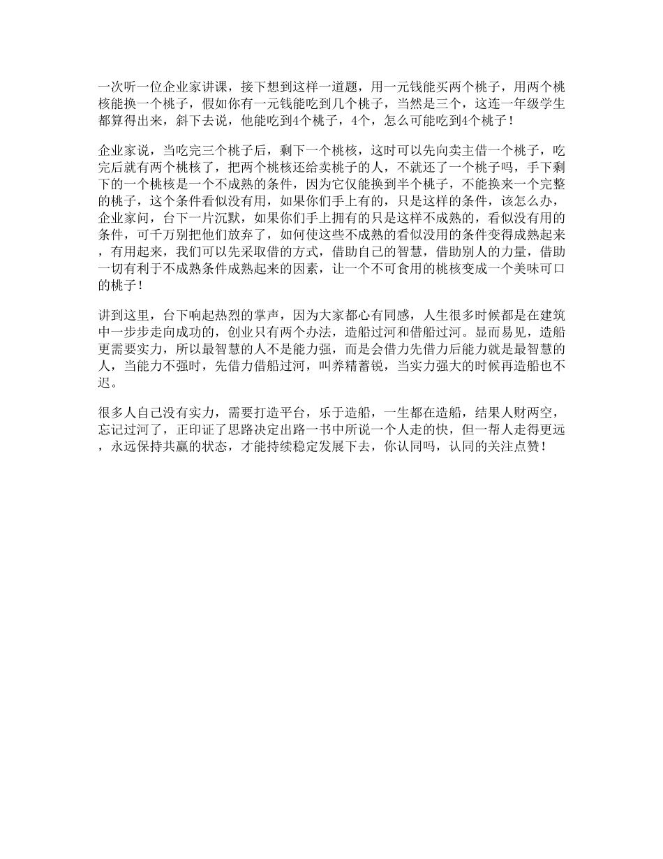 一次听一位企业家讲课,接下想到这样一道题,用一元钱能买两个桃子,用两个桃核能换一个桃子,假如你有一元钱能吃到几个桃子,当然是三个,这连一年级学生都算得出来,斜下去说,他能吃到4个桃子,4个,怎么可能...