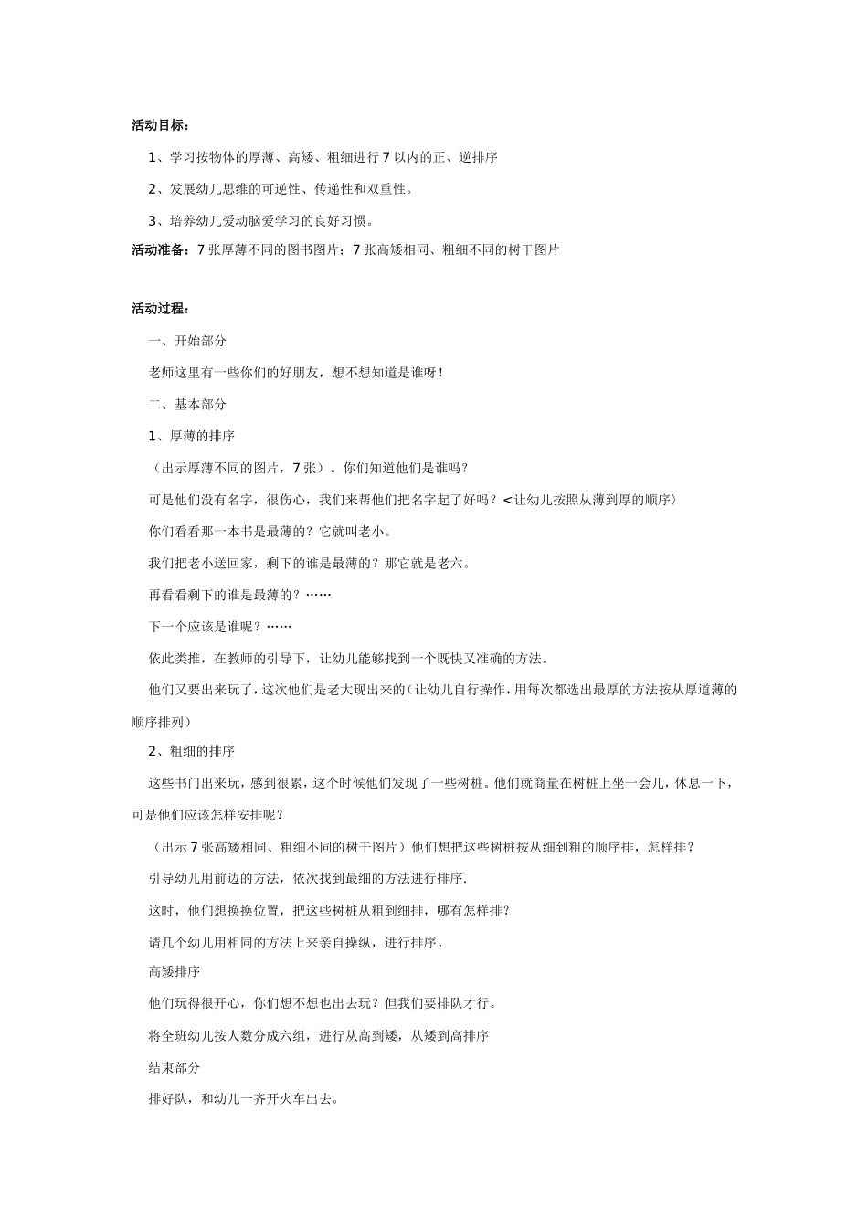 活动目标:1、学习按物体的厚薄、高矮、粗细进行7以内的正、逆排序2、发展幼儿思维的可逆性、传递性和双重性。3、培养幼儿爱动脑爱学习的良好习惯。活动准备:7张厚薄不同的图书图片;7张高矮相同、粗细不同的树...