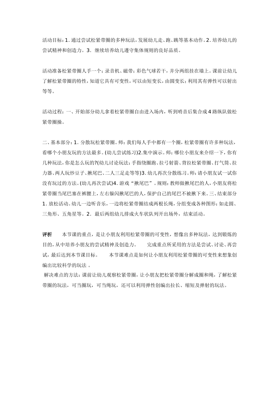 活动目标:1.通过尝试松紧带圈的多种玩法,发展幼儿走、跑、跳等基本动作。2.培养幼儿的尝试精神和创造力。3.继续培养幼儿遵守集体规则的良好品质。活动准备松紧带圈人手一个;录音机、磁带;彩色气球若干,并...