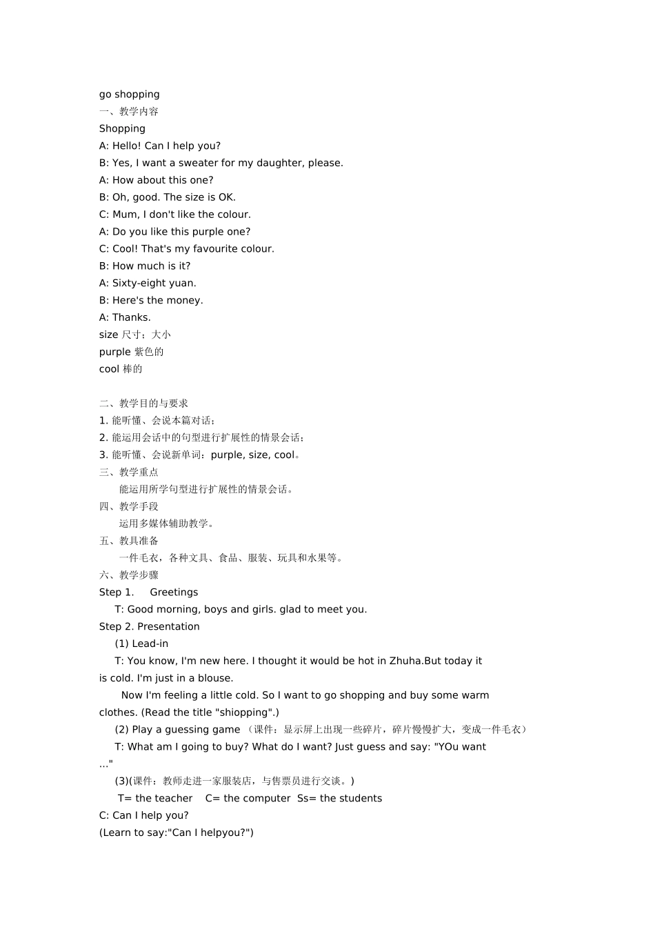 goshopping一、教学内容ShoppingA:Hello!CanIhelpyou?B:Yes,Iwantasweaterformydaughter,please.A:Howaboutthisone?B:Oh,good.ThesizeisOK.C:Mum,Idon'tlikethecolour.A:Doyoulikethispurpleone?C:Cool!That'smyf...