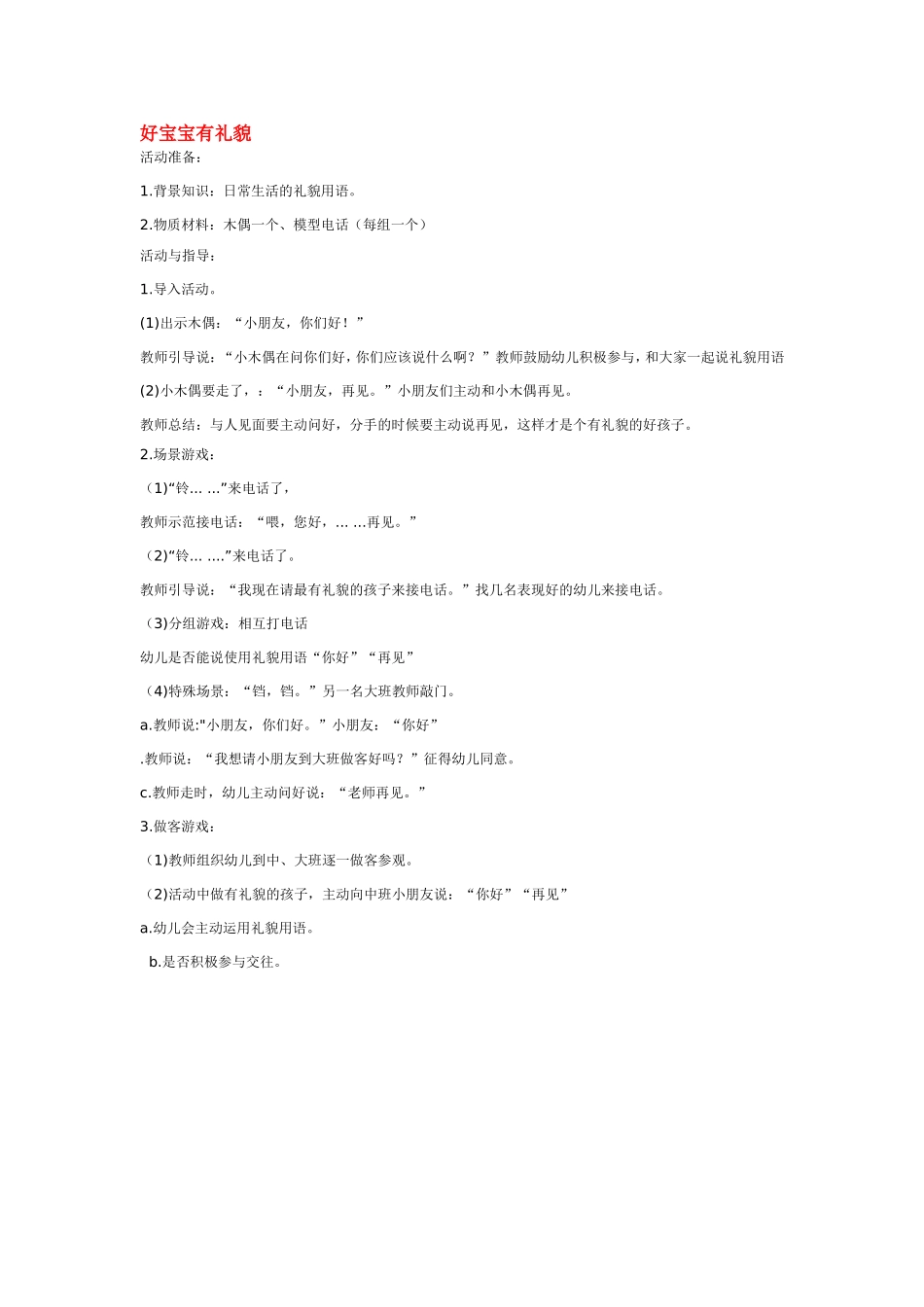好宝宝有礼貌活动准备:1.背景知识:日常生活的礼貌用语。2.物质材料:木偶一个、模型电话(每组一个)活动与指导:1.导入活动。(1)出示木偶:“小朋友,你们好!”教师引导说:“小木偶在问你们好,你们应该说什...