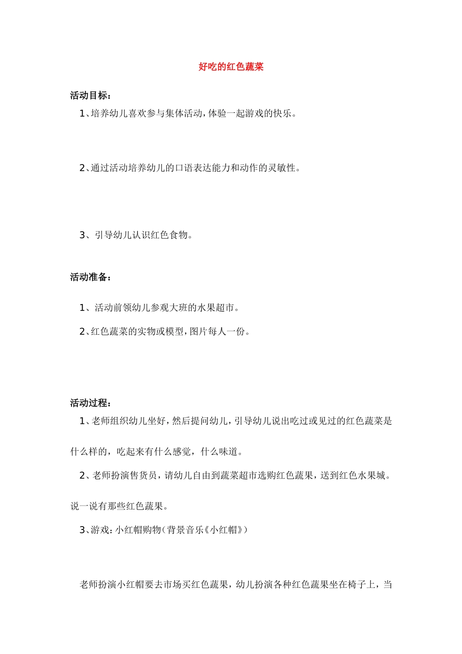 好吃的红色蔬菜活动目标:1、培养幼儿喜欢参与集体活动,体验一起游戏的快乐。2、通过活动培养幼儿的口语表达能力和动作的灵敏性。3、引导幼儿认识红色食物。活动准备:1、活动前领幼儿参观大班的水果超市。2、红...