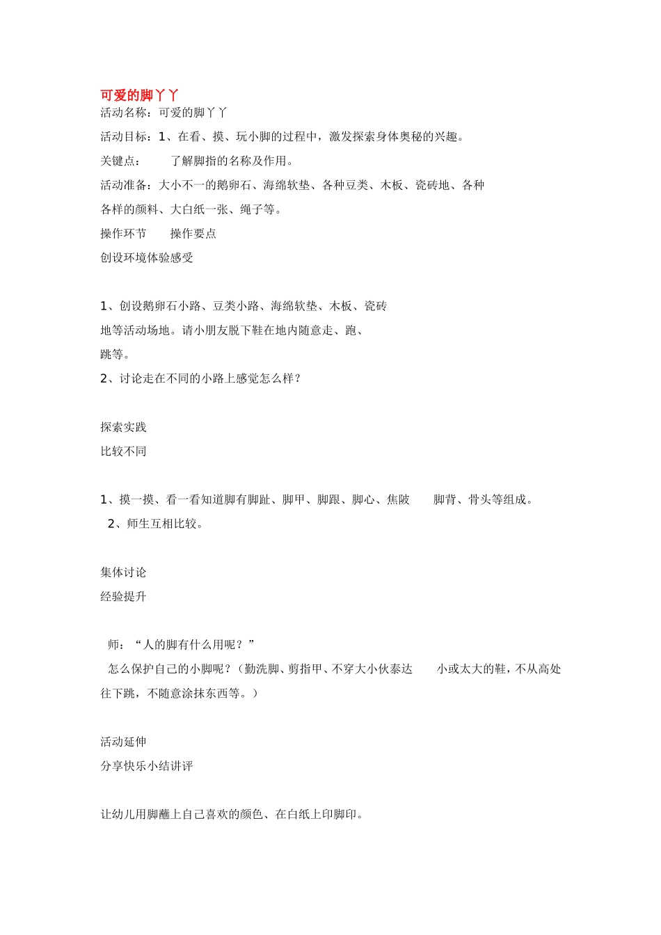 可爱的脚丫丫活动名称:可爱的脚丫丫活动目标:1、在看、摸、玩小脚的过程中,激发探索身体奥秘的兴趣。关键点:了解脚指的名称及作用。活动准备:大小不一的鹅卵石、海绵软垫、各种豆类、木板、瓷砖地、各种各样...