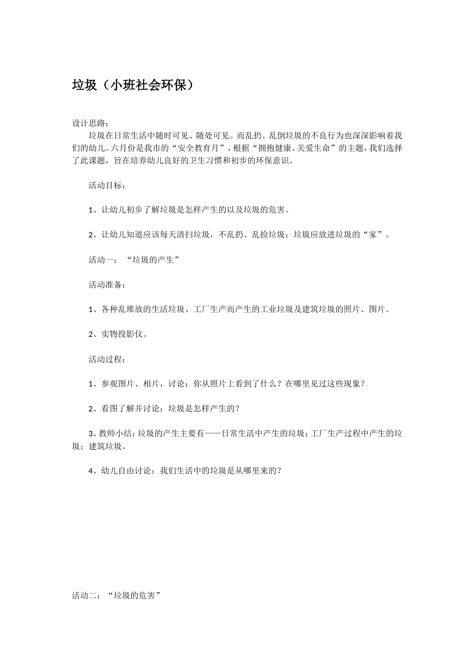 垃圾(小班社会环保)设计思路:垃圾在日常生活中随时可见、随处可见。而乱扔、乱倒垃圾的不良行为也深深影响着我们的幼儿。六月份是我市的“安全教育月”,根据“拥抱健康、关爱生命”的主题,我们选择了此课题...