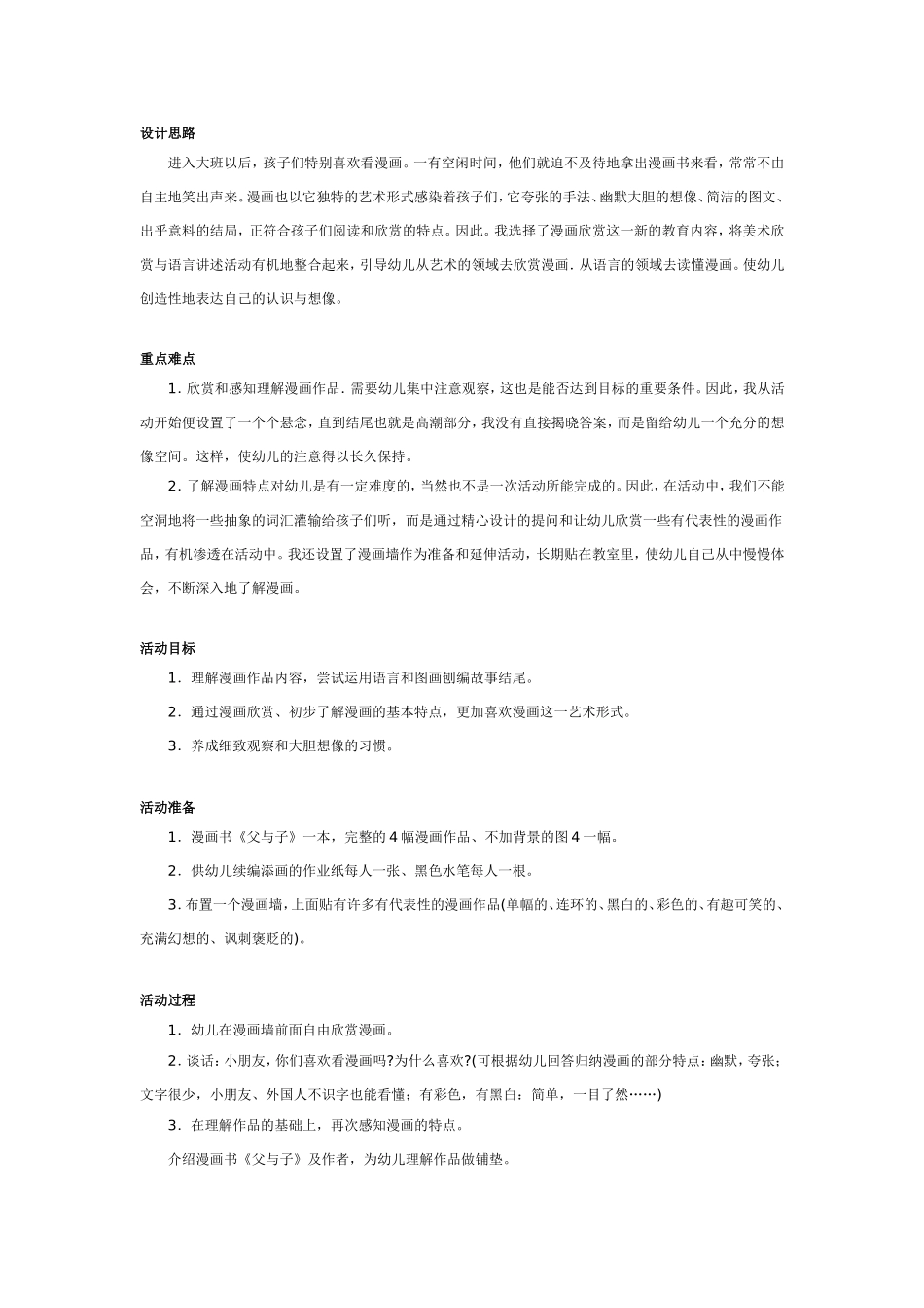 设计思路进入大班以后,孩子们特别喜欢看漫画。一有空闲时间,他们就迫不及待地拿出漫画书来看,常常不由自主地笑出声来。漫画也以它独特的艺术形式感染着孩子们,它夸张的手法、幽默大胆的想像、简洁的图文、出...