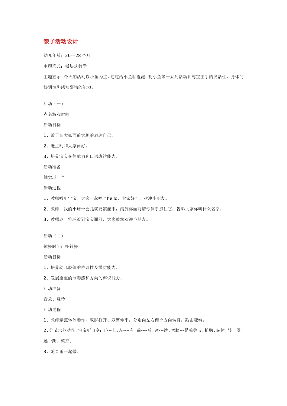 亲子活动设计幼儿年龄:20---28个月主题形式:板块式教学主题宣示:今天的活动以小鱼为主,通过给小鱼粘泡泡,捉小鱼等一系列活动训练宝宝手的灵活性,身体的协调性和感知事物的能力。活动(一)点名游戏时间活动...