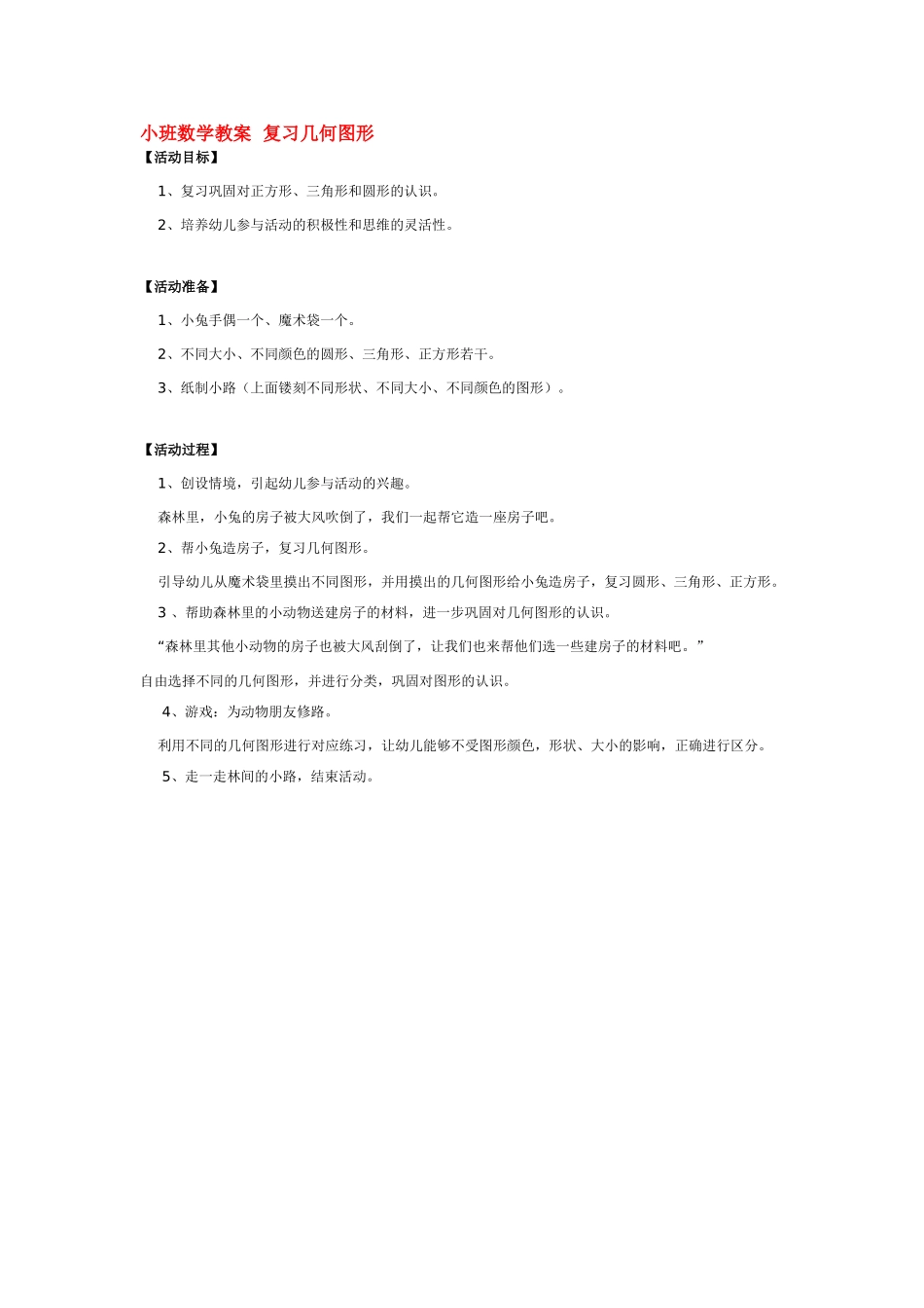 小班数学教案复习几何图形【活动目标】1、复习巩固对正方形、三角形和圆形的认识。2、培养幼儿参与活动的积极性和思维的灵活性。【活动准备】1、小兔手偶一个、魔术袋一个。2、不同大小、不同颜色的圆形、三角形...