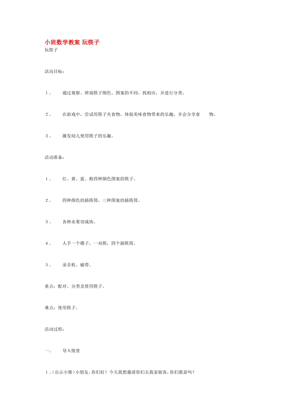 小班数学教案玩筷子玩筷子活动目标:1、通过观察、辨别筷子颜色、图案的不同,找相应,并进行分类。2、在游戏中,尝试用筷子夹食物,体验美味食物带来的乐趣,并会分享食物。3、激发幼儿使用筷子的乐趣。活动...