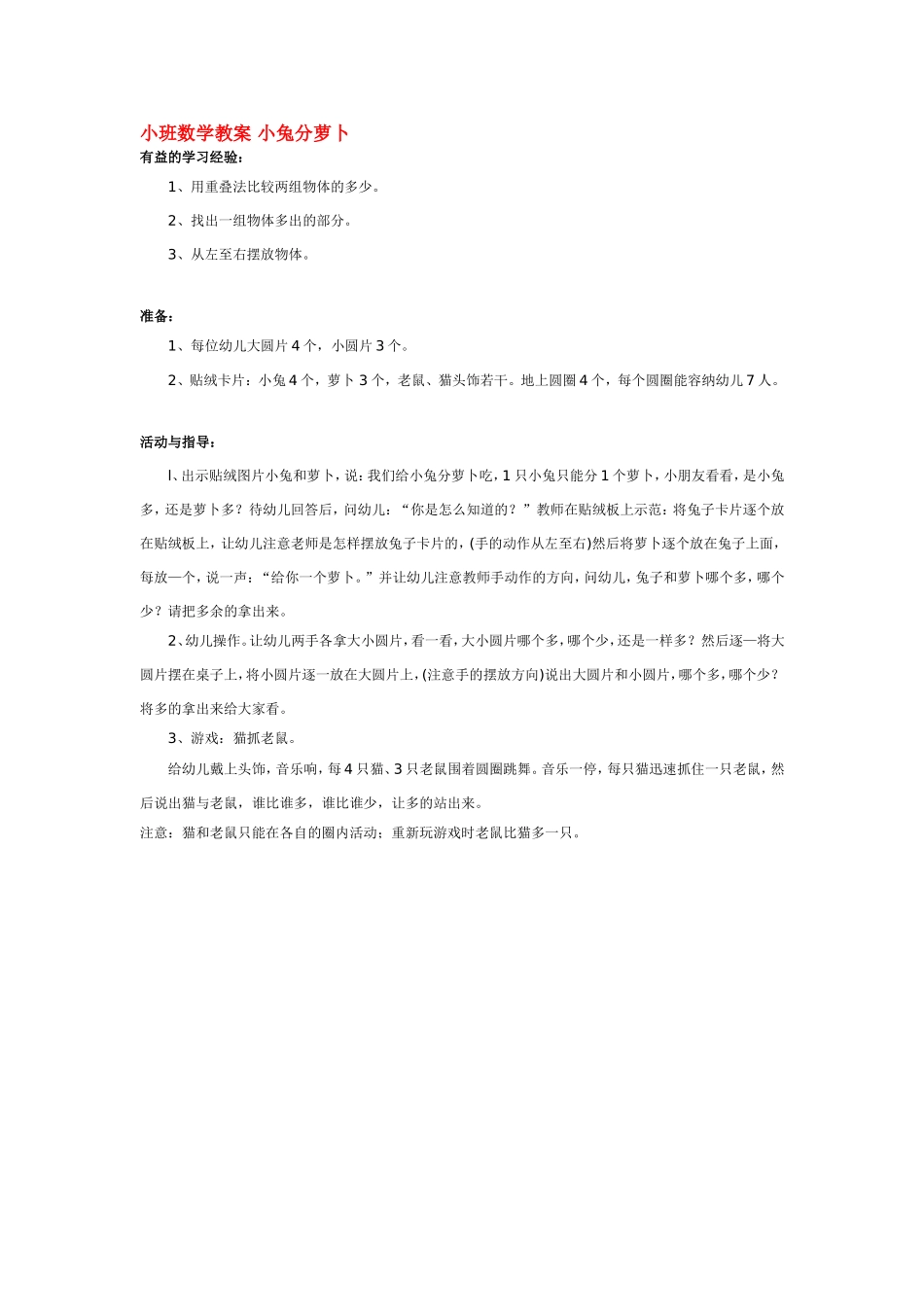 小班数学教案小兔分萝卜有益的学习经验:1、用重叠法比较两组物体的多少。2、找出一组物体多出的部分。3、从左至右摆放物体。准备:1、每位幼儿大圆片4个,小圆片3个。2、贴绒卡片:小兔4个,萝卜3个,老鼠、猫头...