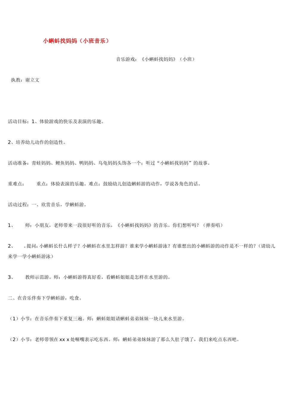 小蝌蚪找妈妈(小班音乐)音乐游戏:《小蝌蚪找妈妈》(小班)执教:谢立文活动目标:1、体验游戏的快乐及表演的乐趣。2、培养幼儿动作的创造性。活动准备:青蛙妈妈、鲤鱼妈妈、鸭妈妈、乌龟妈妈头饰各一个;听...