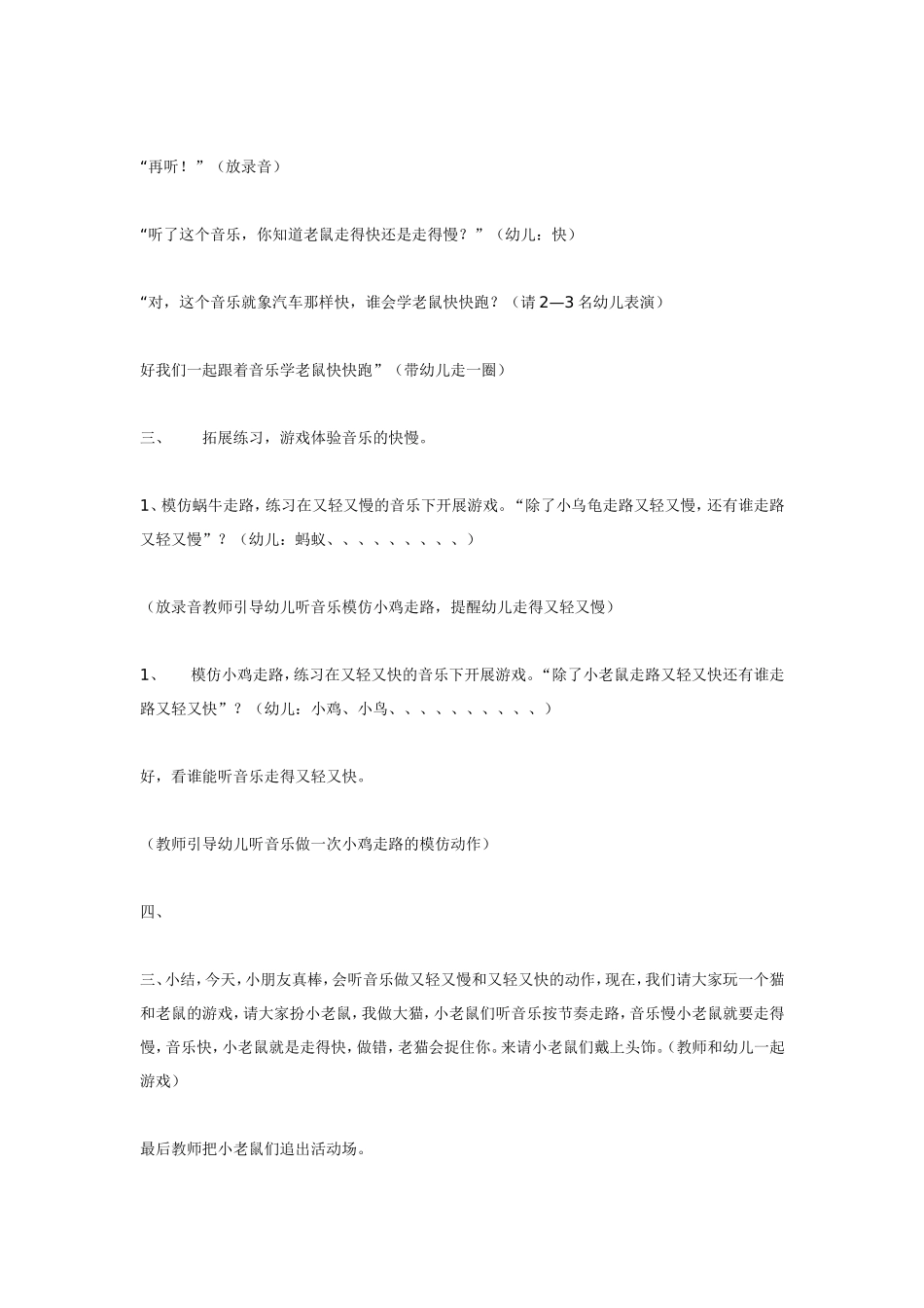 音乐活动教案动物走路小班音乐活动:动物走路活动设计:胡彩菊、钟肖微活动预设目标:通过活动,引导幼儿感知音乐的“轻与快”、“轻与慢”。培养幼儿的音乐节奏感。活动准备:VCD“猫和老鼠”片段、课件、头饰、...