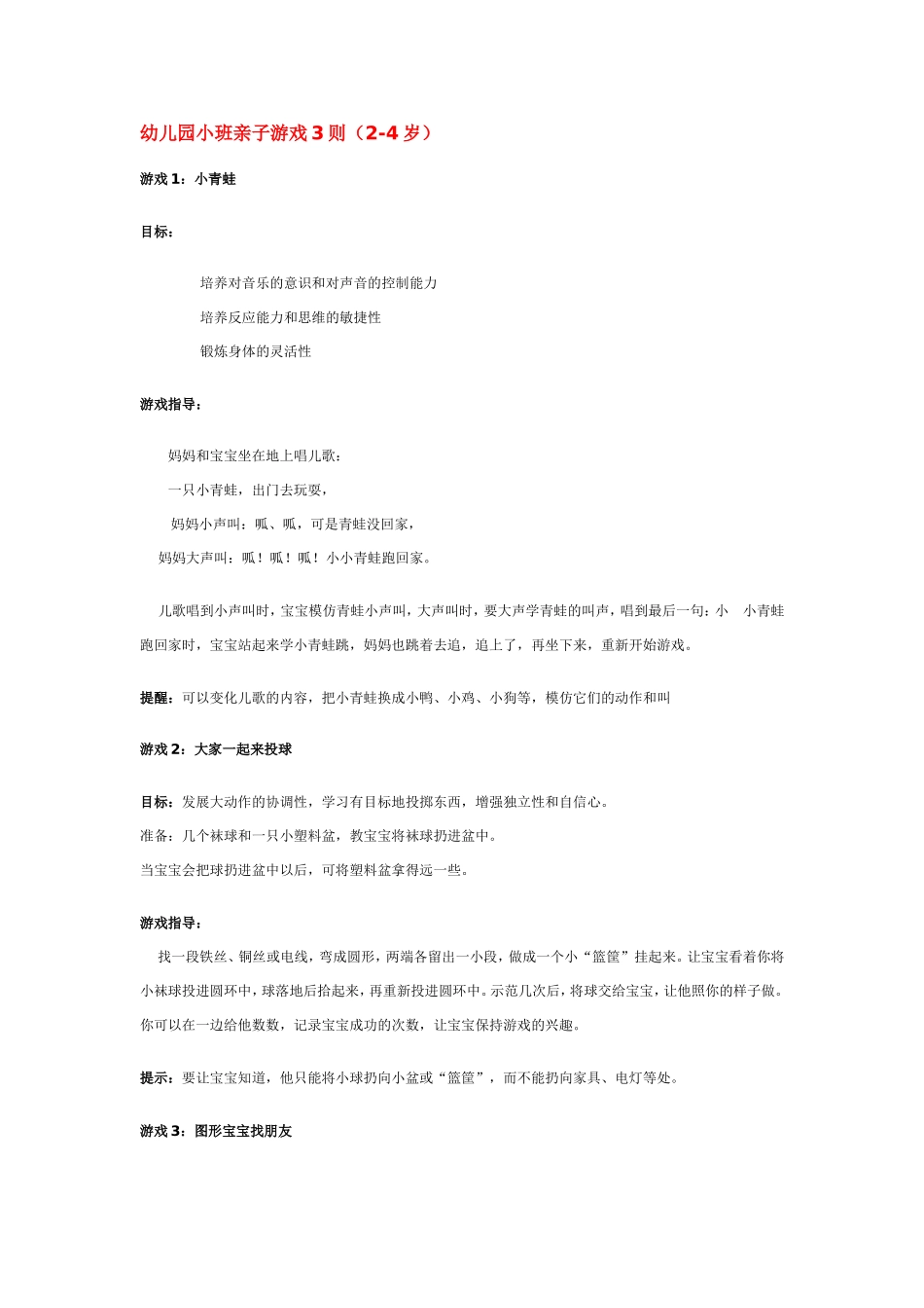 幼儿园小班亲子游戏3则(2-4岁)游戏1:小青蛙目标:培养对音乐的意识和对声音的控制能力培养反应能力和思维的敏捷性锻炼身体的灵活性游戏指导:妈妈和宝宝坐在地上唱儿歌:一只小青蛙,出门去玩耍,妈妈小声叫:...