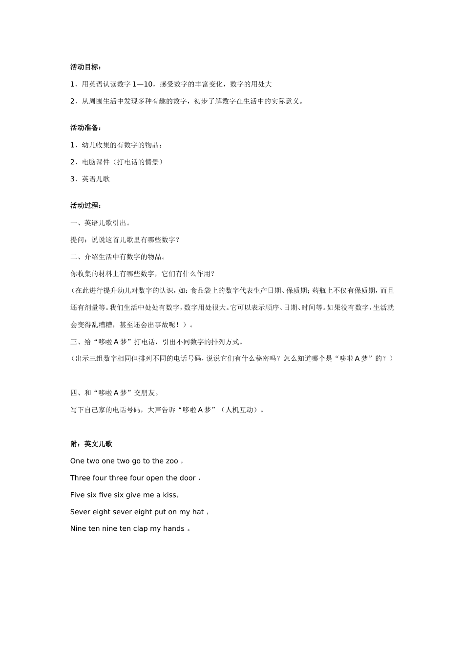 活动目标:1、用英语认读数字1—10,感受数字的丰富变化,数字的用处大2、从周围生活中发现多种有趣的数字,初步了解数字在生活中的实际意义。活动准备:1、幼儿收集的有数字的物品;2、电脑课件(打电话的情景)...