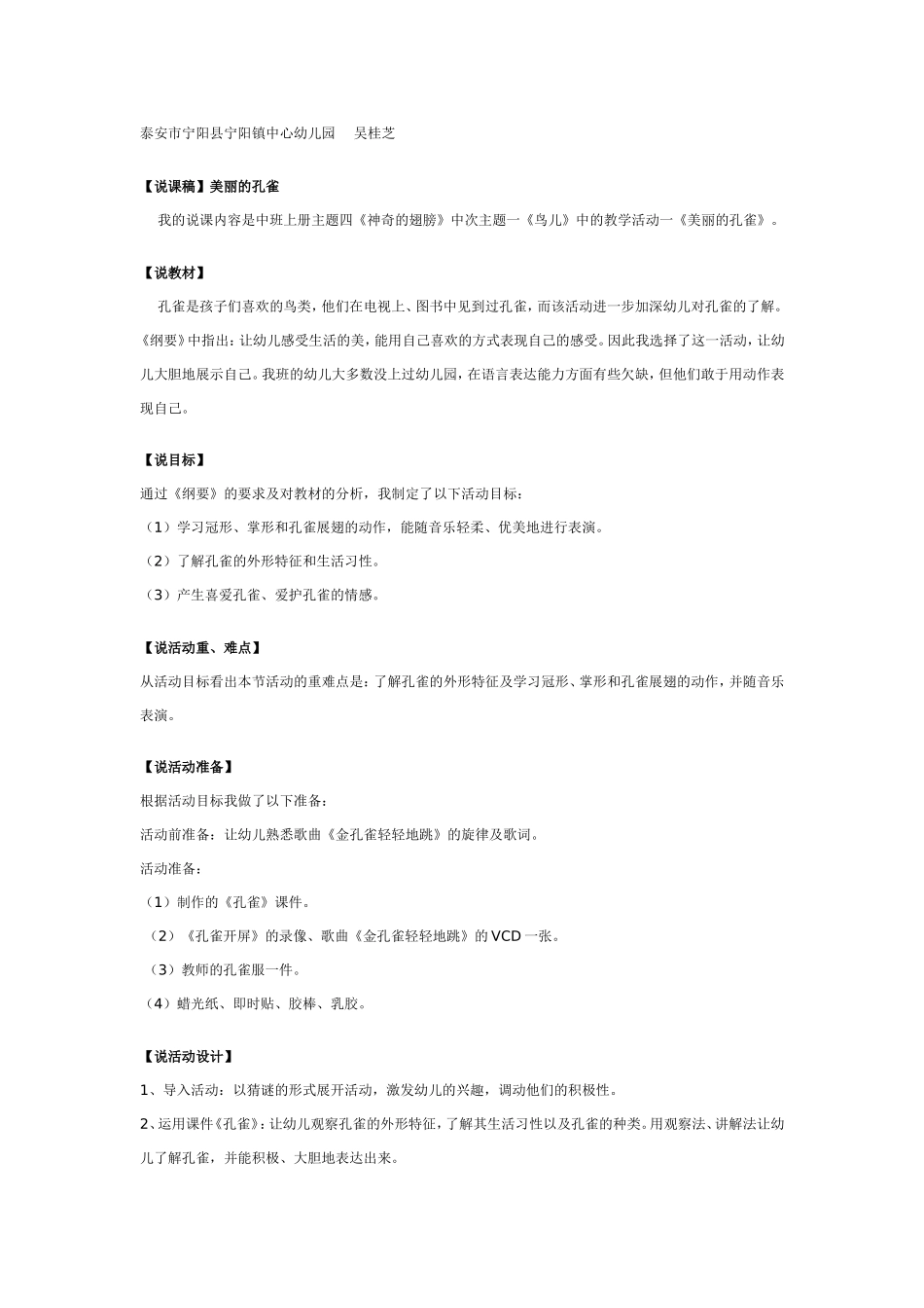 泰安市宁阳县宁阳镇中心幼儿园吴桂芝【说课稿】美丽的孔雀我的说课内容是中班上册主题四《神奇的翅膀》中次主题一《鸟儿》中的教学活动一《美丽的孔雀》。【说教材】孔雀是孩子们喜欢的鸟类,他们在电视上、图书...