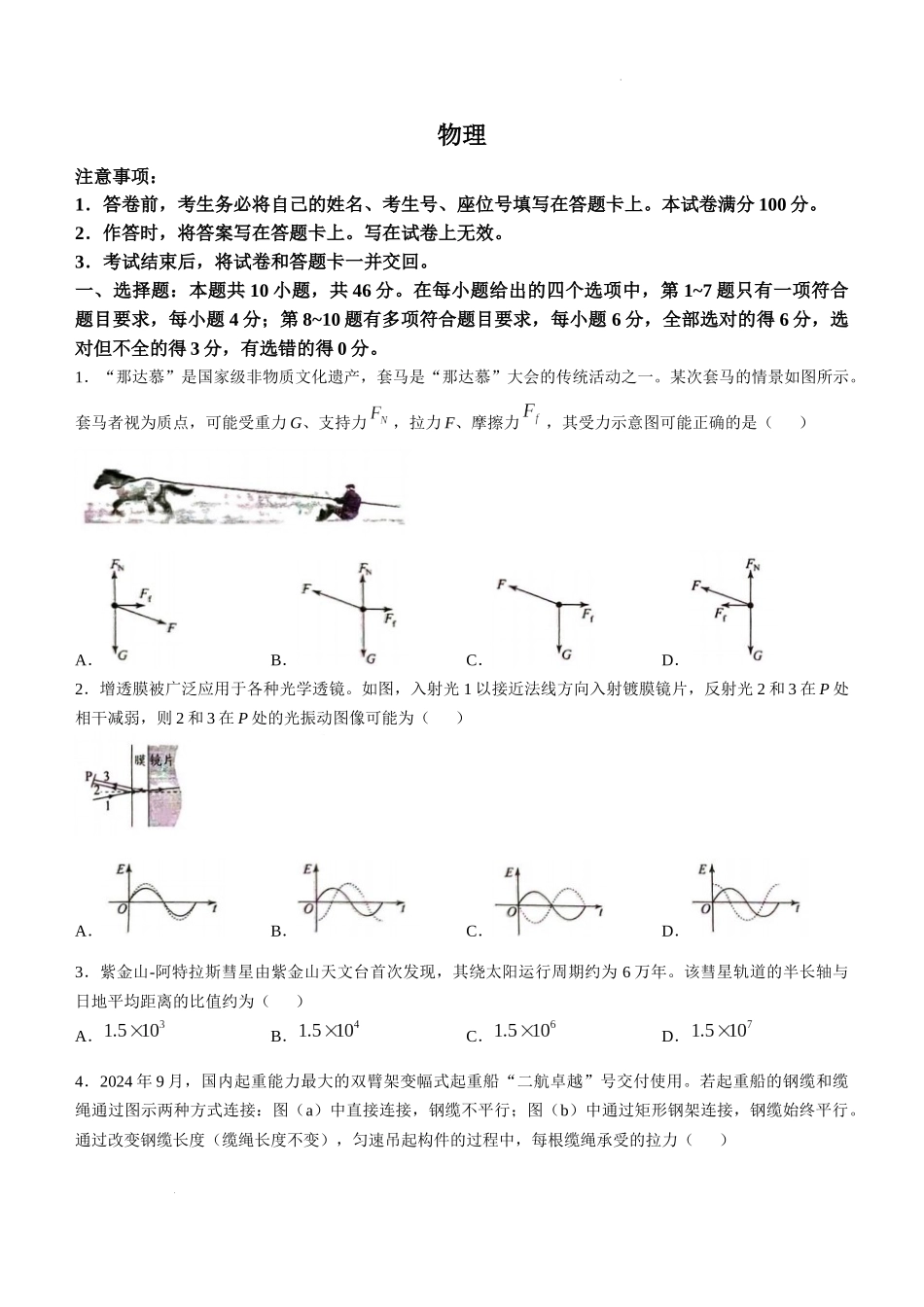 物理注意事项:1.答卷前,考生务必将自己的姓名、考生号、座位号填写在答题卡上。本试卷满分100分。2.作答时,将答案写在答题卡上。写在试卷上无效。3.考试结束后,将试卷和答题卡一并交回。一、选择题:本题...