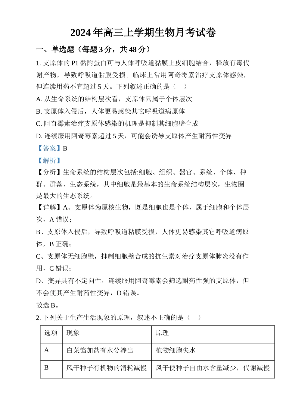 2024年高三上学期生物月考试卷一、单选题(每题3分,共48分)1.支原体的P1黏附蛋白可与人体呼吸道黏膜上皮细胞结合,释放有毒代谢产物,导致呼吸道黏膜受损。临床上常用阿奇霉素治疗支原体感染,但连续用药不宜超...