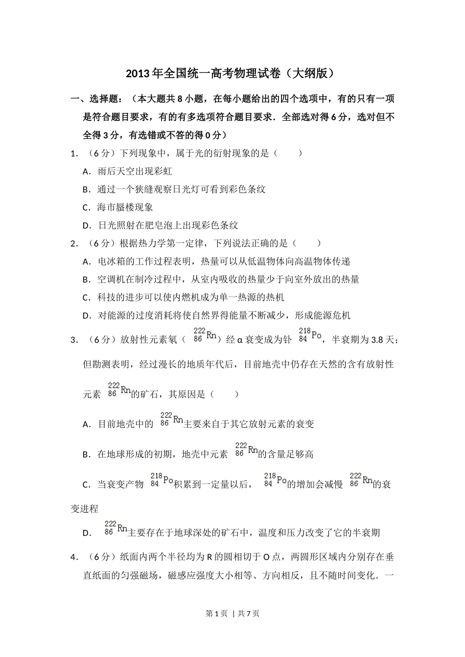 2013年高考物理试卷(大纲版)(空白卷).docx_第1页