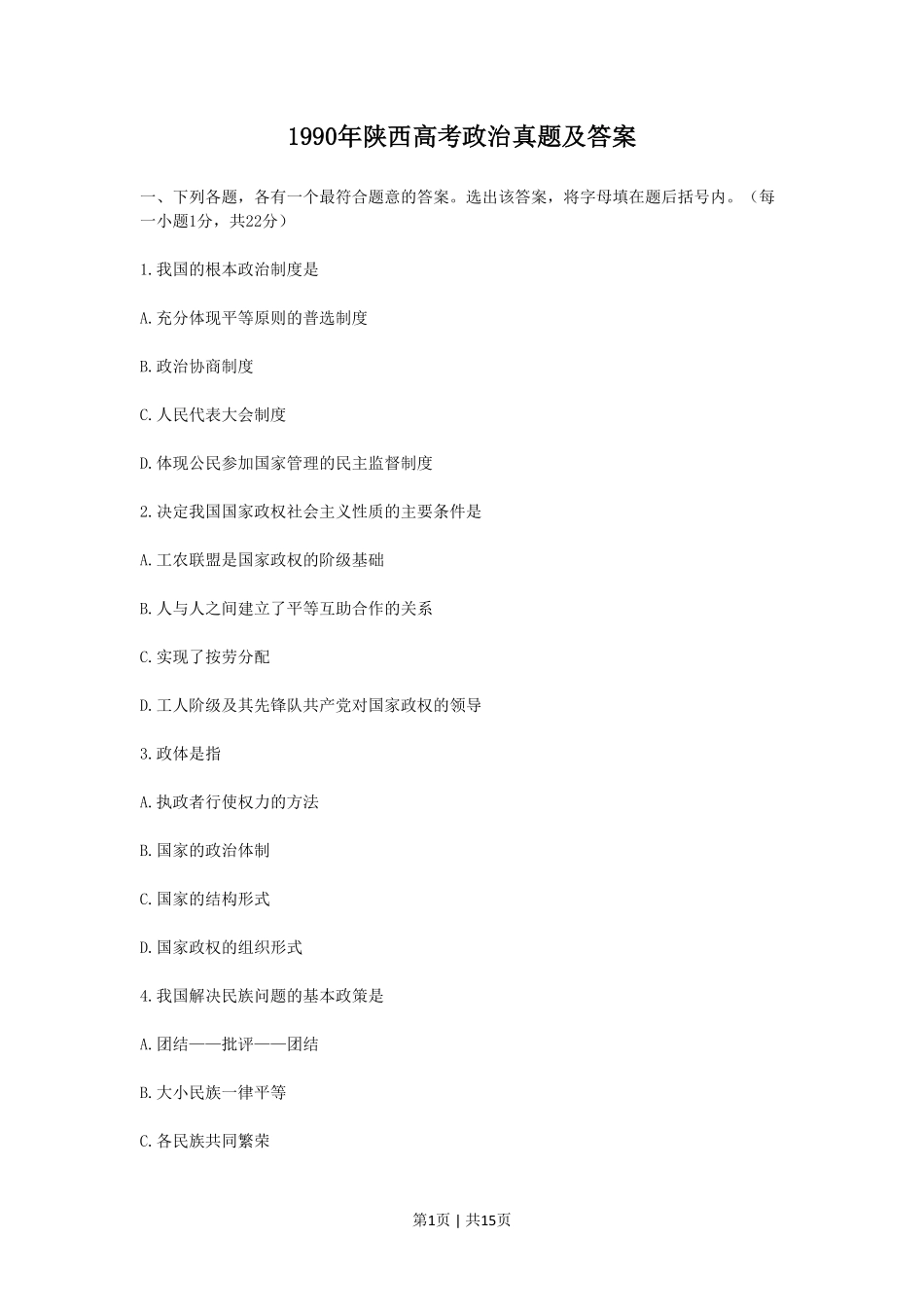 第1页|共15页1990年陕西高考政治真题及答案一、下列各题,各有一个最符合题意的答案。选出该答案,将字母填在题后括号内。(每一小题1分,共22分)1.我国的根本政治制度是A.充分体现平等原则的普选制度B.政治协商...