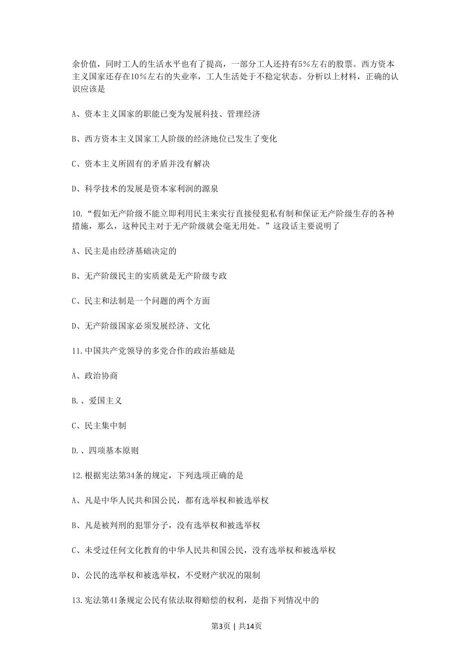第1页|共14页1991年安徽高考政治真题及答案一、下列各题,各有一个最符合题意的答案。请把所选答案的字母填在题后括号内。(每一小题1分,共17分)1.学习《政治常识》,必须掌握、运用阶级观点和阶级分析方法。因...