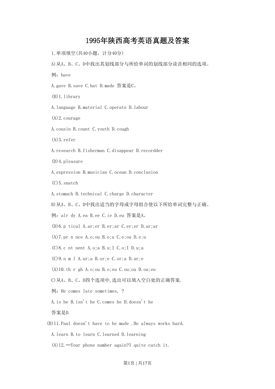 第1页|共17页1995年陕西高考英语真题及答案1.单项填空(共40小题,计分40分)A)从A、B、C、D中找出其划线部分与所给单词的划线部分读音相同的选项。例:haveA.gaveB.saveC.hatD.made答案是C。(B)1.libraryA.languag...