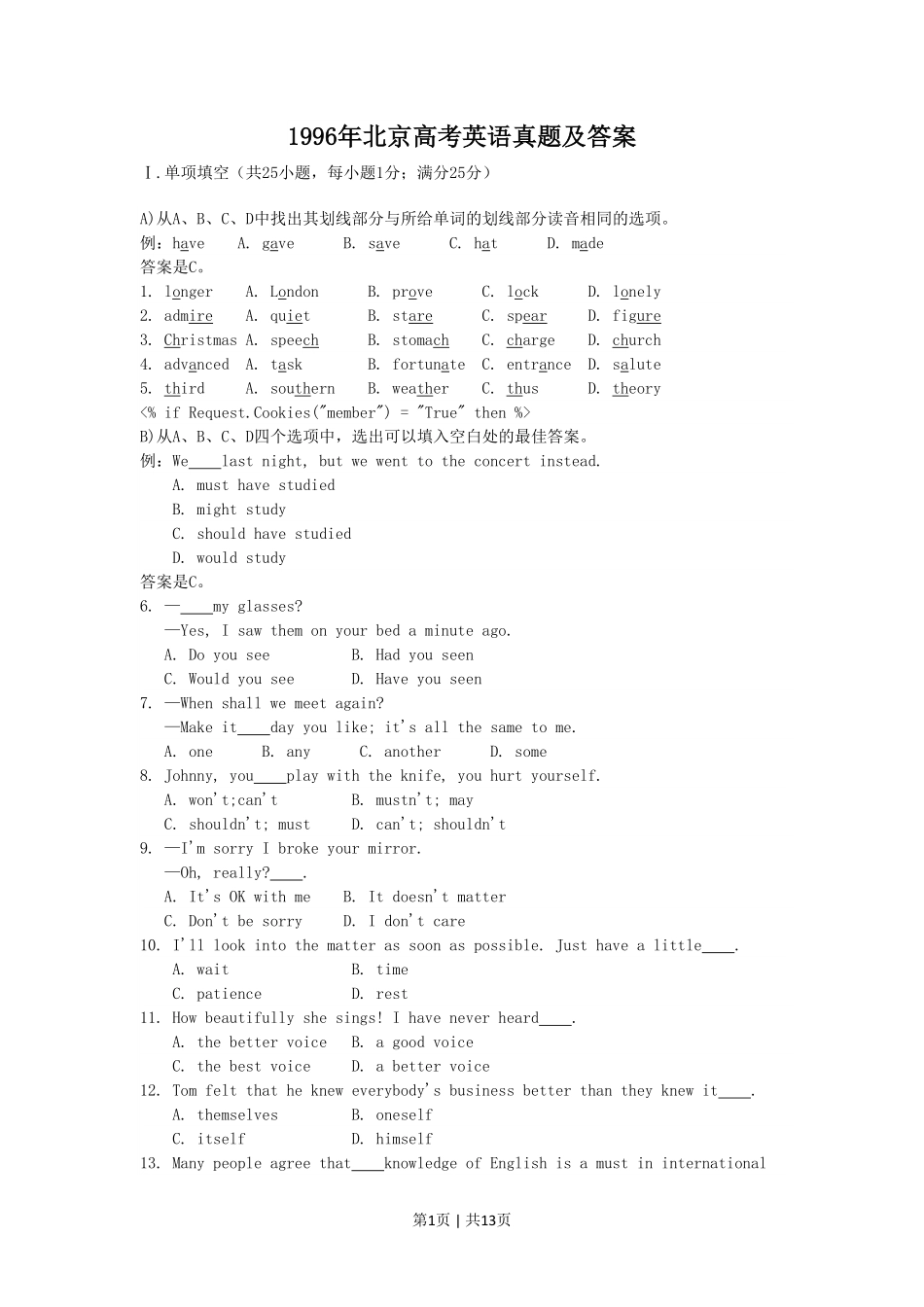 第1页|共13页1996年北京高考英语真题及答案Ⅰ.单项填空(共25小题,每小题1分;满分25分)A)从A、B、C、D中找出其划线部分与所给单词的划线部分读音相同的选项。例:haveA.gaveB.saveC.hatD.made答案是C。1.longe...