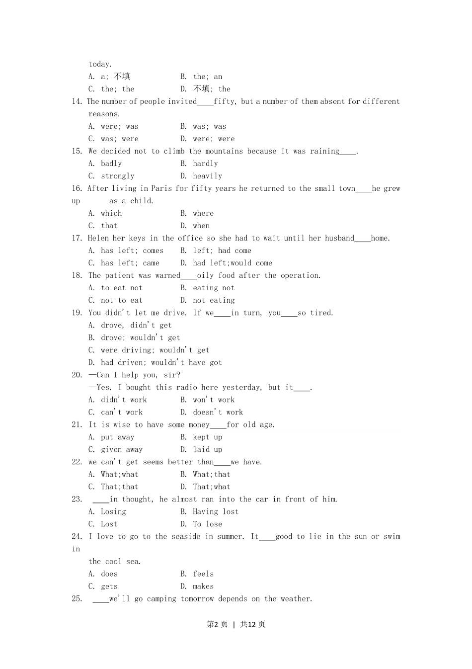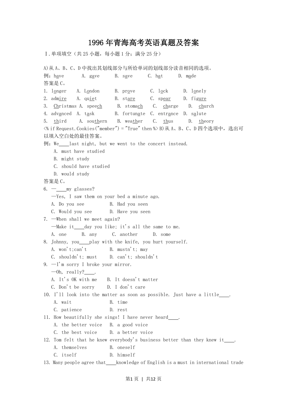 第1页|共12页1996年青海高考英语真题及答案Ⅰ.单项填空(共25小题,每小题1分;满分25分)A)从A、B、C、D中找出其划线部分与所给单词的划线部分读音相同的选项。例:haveA.gaveB.saveC.hatD.made答案是C。1.longe...