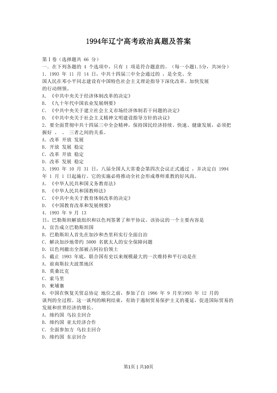 第1页|共10页1994年辽宁高考政治真题及答案第Ⅰ卷(选择题共66分)一.在下列各题的4个选项中,只有1项是符合题意的。(每一小题1.5分,共36分)1.1993年11月14日,中共十四届三中全会通过的,是全党、全国人民...