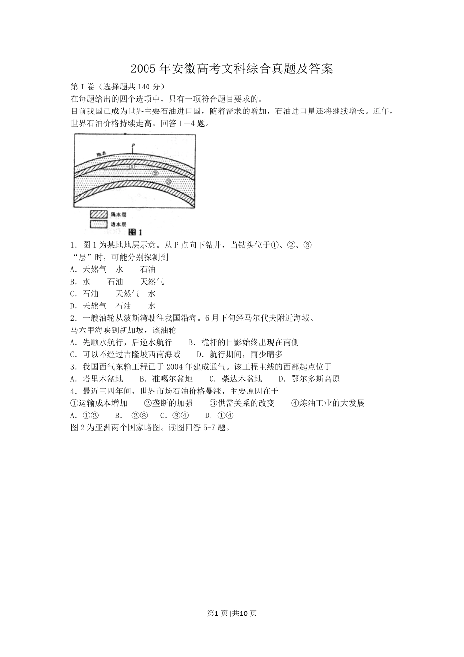 第1页|共10页2005年安徽高考文科综合真题及答案第I卷(选择题共140分)在每题给出的四个选项中,只有一项符合题目要求的。目前我国已成为世界主要石油进口国,随着需求的增加,石油进口量还将继续增长。近年,世...