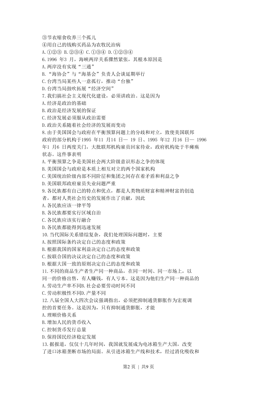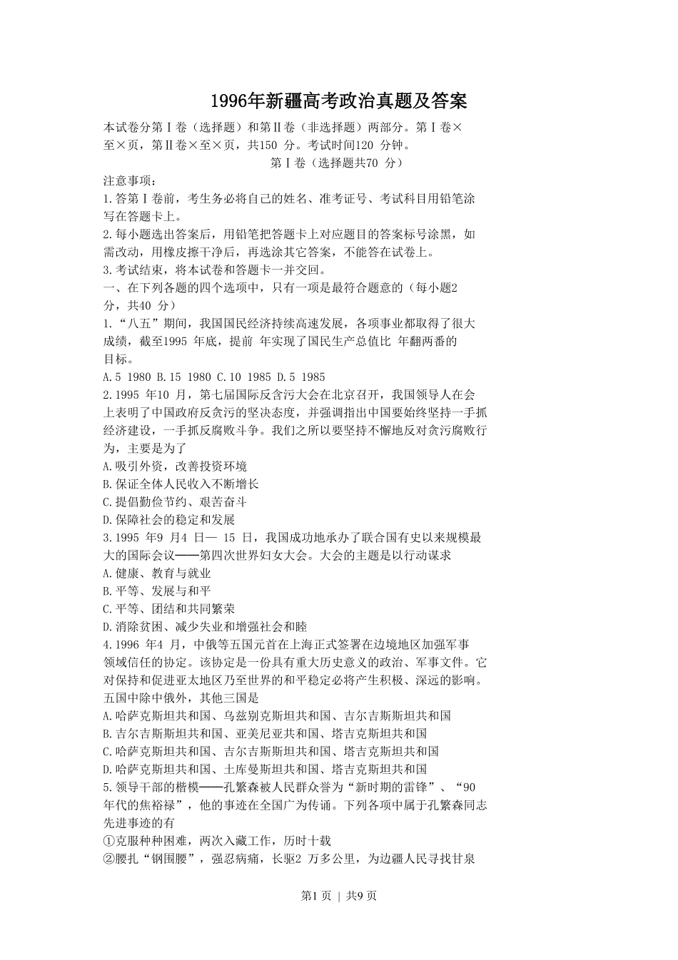 第1页|共9页1996年新疆高考政治真题及答案本试卷分第Ⅰ卷(选择题)和第Ⅱ卷(非选择题)两部分。第Ⅰ卷×至×页,第Ⅱ卷×至×页,共150分。考试时间120分钟。第Ⅰ卷(选择题共70分)注意事项:1.答第Ⅰ卷前,考...