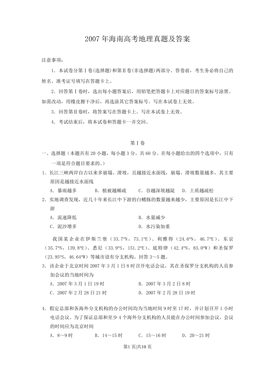 第1页|共10页2007年海南高考地理真题及答案注意事项:1.本试卷分第Ⅰ卷(选择题)和第Ⅱ卷(非选择题)两部分。答卷前,考生务必将自己的姓名、准考证号填写在答题卡上。2.回答第Ⅰ卷时,选出每小题答案后,用铅笔...