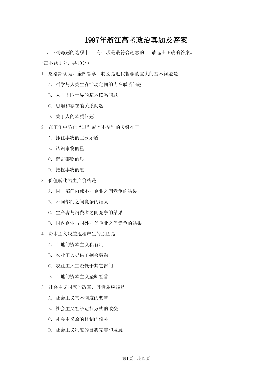 第1页|共12页1997年浙江高考政治真题及答案一、下列每题的选项中,有一项是最符合题意的。请选出正确的答案。<每小题1分,共10分)1.恩格斯认为,全部哲学、特别是近代哲学的重大的基本问题是A.哲学与人类生存活...