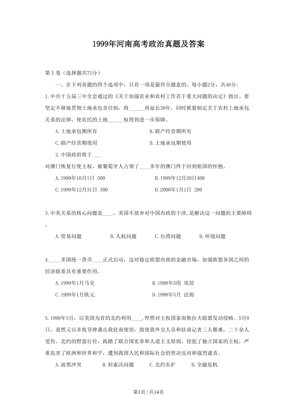 第1页|共14页1999年河南高考政治真题及答案第Ⅰ卷(选择题共75分)一、在下列各题的四个选项中,只有一项是最符合题意的。每小题2分,共48分。1.中共十五届三中全会通过的《关于加强农业和农村工作若干重大问题的...