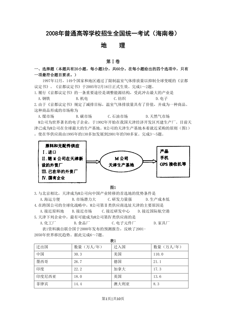 第1页|共10页2008年普通高等学校招生全国统一考试(海南卷)地理第Ⅰ卷一、选择题(本题共有20小题,每小题3分,共60分。在每小题给出的四个选项中,只有一项最符合题目要求。)1997年12月,149个国家和地区通过...