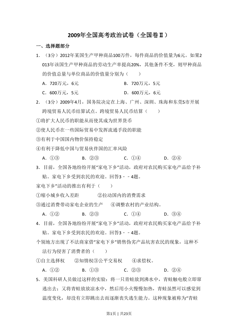第1页|共23页2009年全国高考政治试卷(全国卷Ⅱ)一、选择题部分1.(3分)2012年某国生产甲种商品100万件,每件商品的价值量为6元。如果2013年该国生产甲种商品的劳动生产率提高20%,其他条件不变,则甲种商品的...