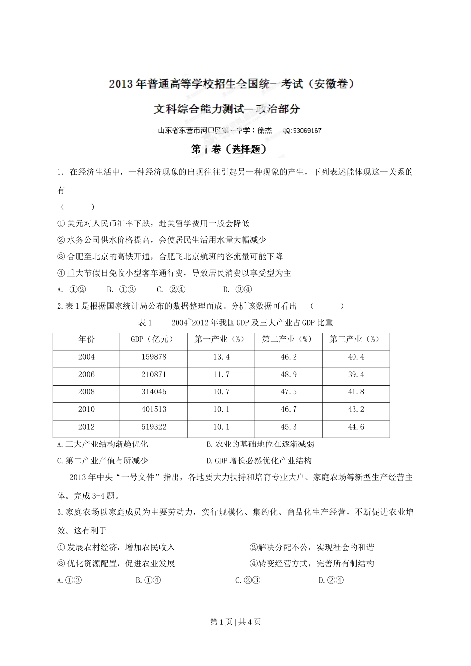 2013年高考政治试卷(安徽)(空白卷).doc_第1页