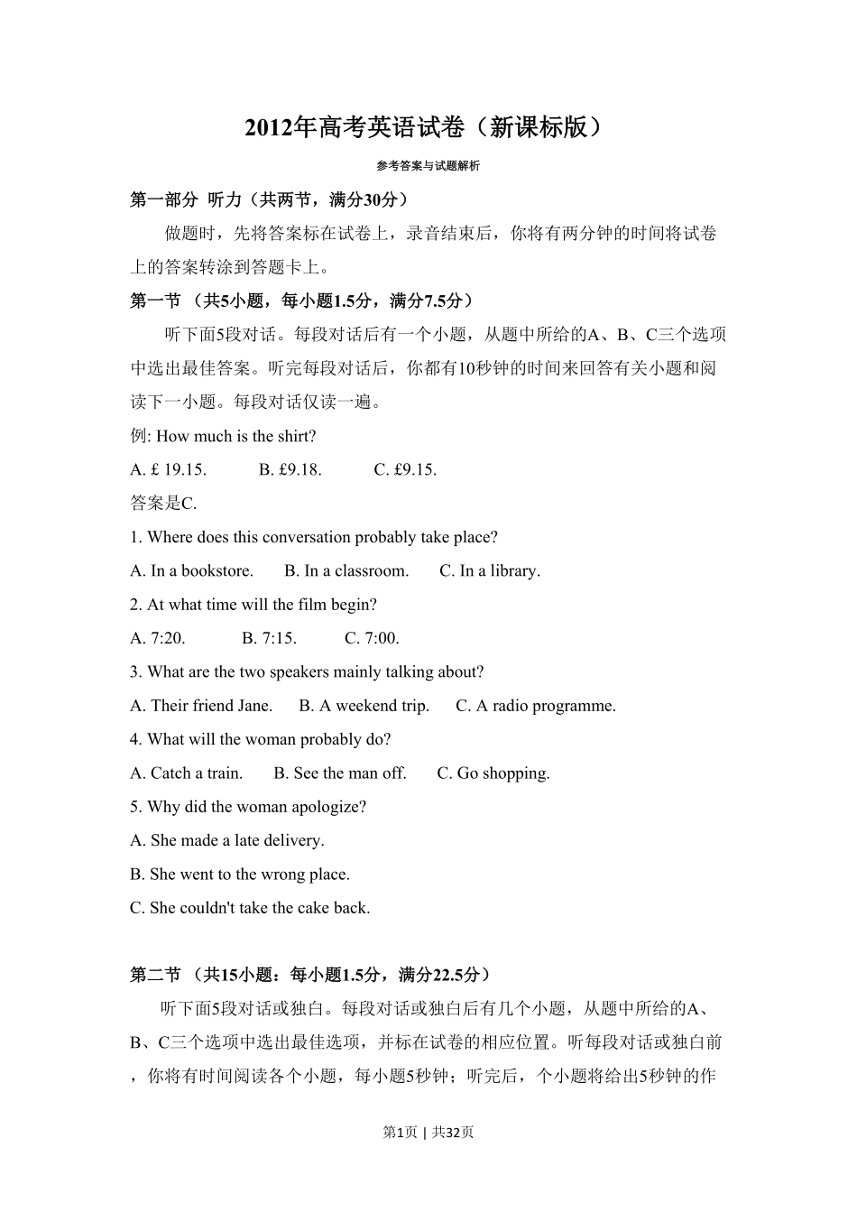 第1页|共32页2012年高考英语试卷(新课标版)参考答案与试题解析第一部分听力(共两节,满分30分)做题时,先将答案标在试卷上,录音结束后,你将有两分钟的时间将试卷上的答案转涂到答题卡上。第一节(共5小题,...