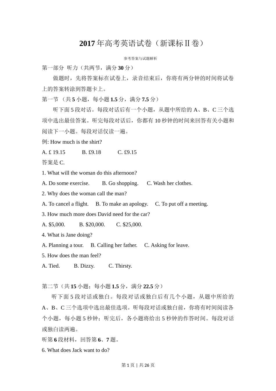 2017年高考英语试卷(新课标Ⅱ卷)参考答案与试题解析第一部分听力(共两节,满分30分)做题时,先将答案标在试卷上,录音结束后,你将有两分钟的时间将试卷上的答案转涂到答题卡上。第一节(共5小题,每小题1.5...