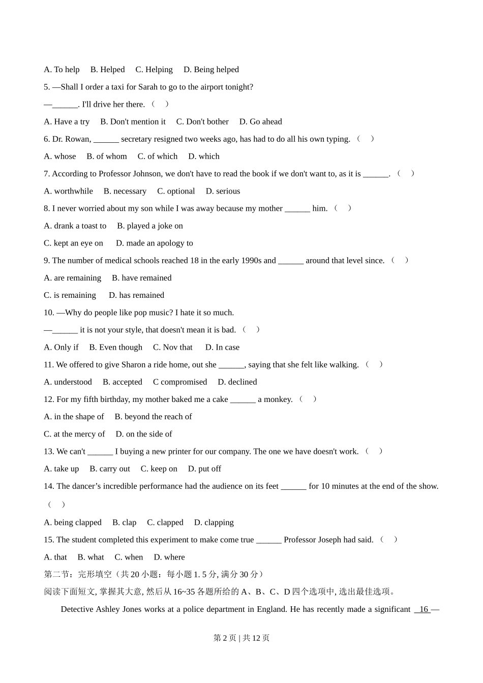2020年高考英语试卷(天津)(第二次)(空白卷).doc_第2页