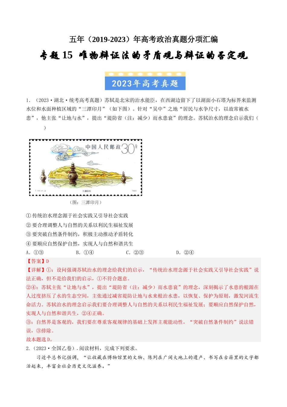 五年(2019-2023)年高考政治真题分项汇编专题15唯物辩证法的矛盾观与辩证的否定观1.(2023·湖北·统考高考真题)苏轼是北宋的治水能臣,在西湖边留下了以湖面小石塔为标界来监测水位和水面种植区域的“三潭印...
