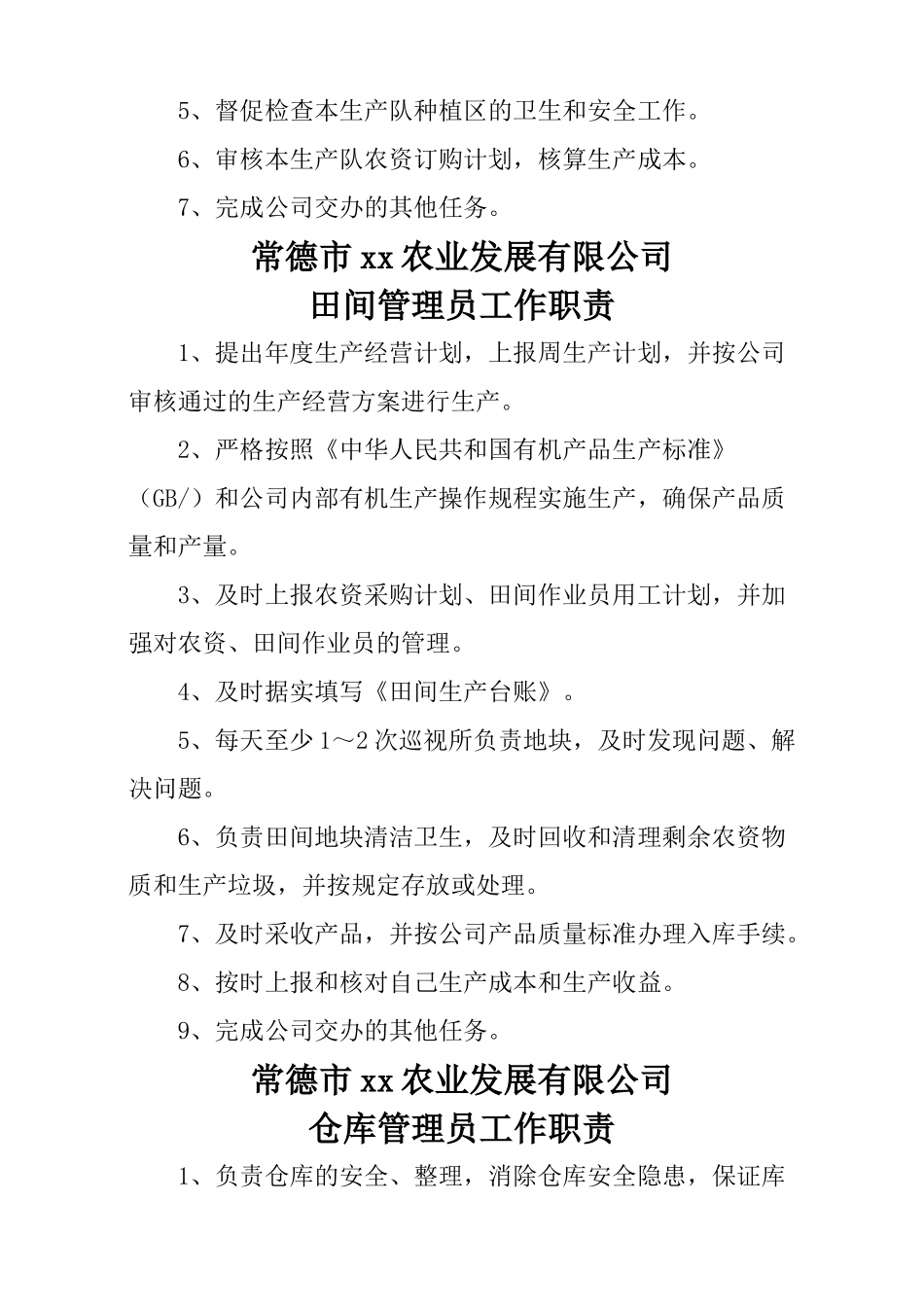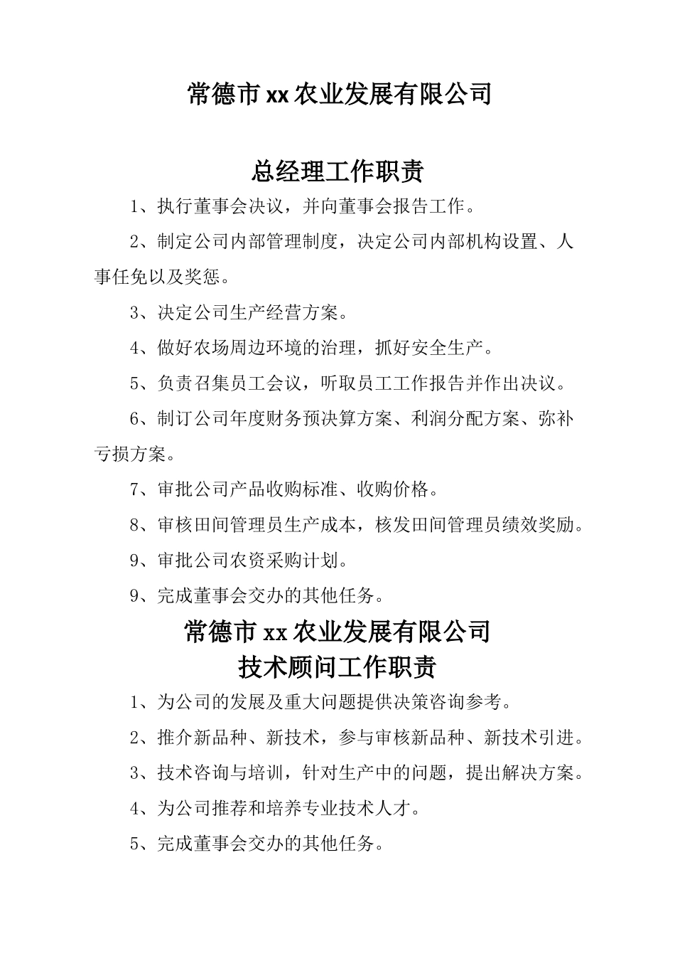 常德市xx农业发展有限公司总经理工作职责1、执行董事会决议,并向董事会报告工作。2、制定公司内部管理制度,决定公司内部机构设置、人事任免以及奖惩。3、决定公司生产经营方案。4、做好农场周边环境的治理,抓...